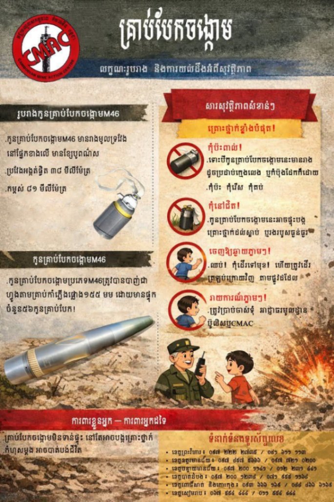 CMAC បានរំលឹកជូនបងប្អូនប្រជាពលរដ្ឋភៀសសឹកទាំងអស់ដែលបានអញ្ជើញវិលត្រឡប់ចូលលំនៅដ្ឋាននៅតាមតំបន់រងផលប៉ះពាល់ដោយសារគ្រាប់ផ្លោងរបស់សៀមឈ្លានពានវិញ សូមមេត្តាប្រុងប្រយត្ន័ខ្ពស់បំផុតចំពោះសំណល់យុទ្ធភណ្ឌមិនទាន់ផ្ទុះដែលស្ថិតនៅរាយប៉ាយតាមដីភូមិឋានស្រែចម្ការរបស់បងប្អូន។