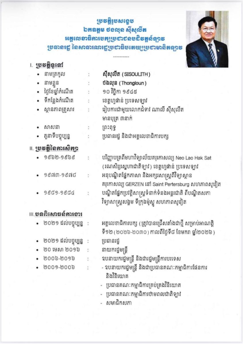 ខាងក្រោមនេះជាប្រវត្តិរូបសង្ខេប ឯកឧត្តមបណ្ឌិត ថងលុន ស៊ីសុលីត (SISOULITH Thongloun)៖