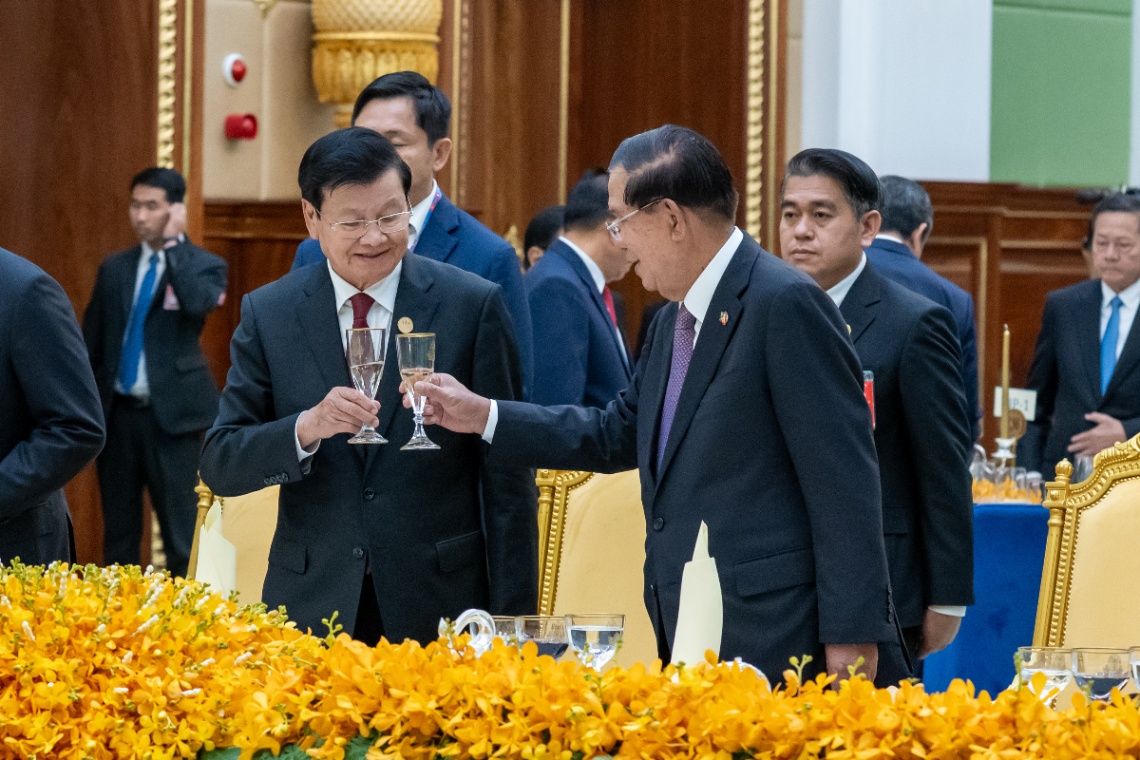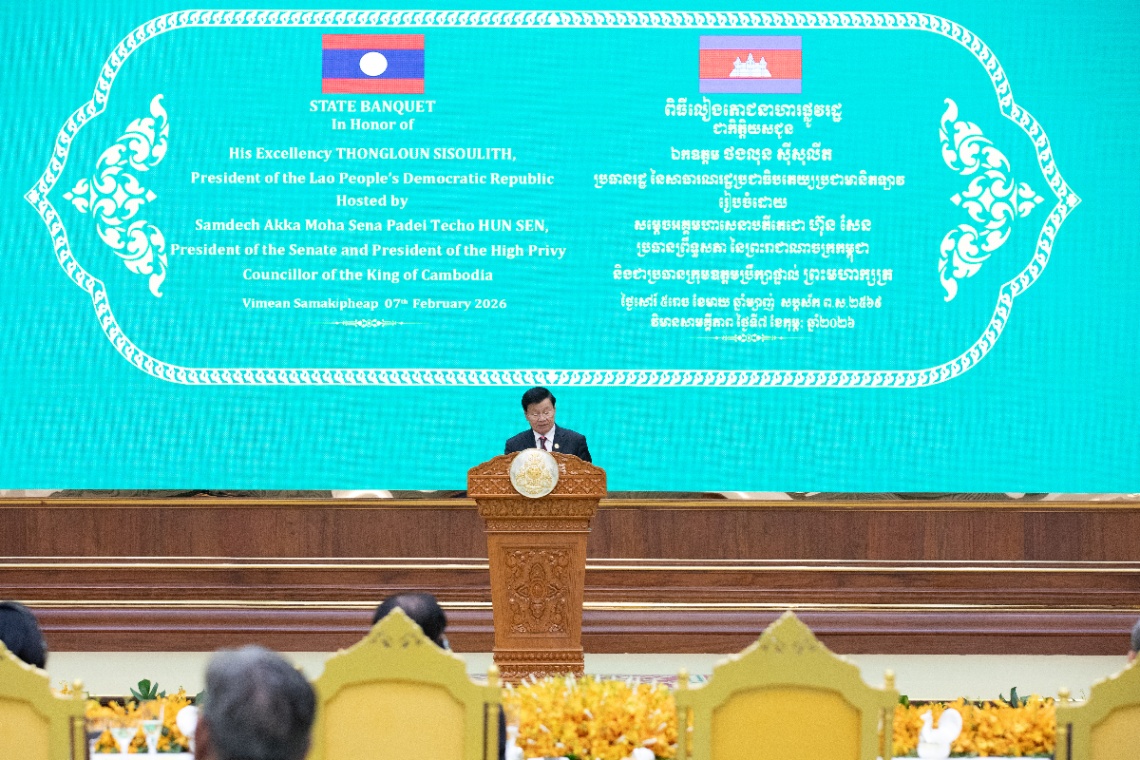 សម្តេចអគ្គមហាសេនាបតីតេជោ ហ៊ុន សែន ប្រធានព្រឹទ្ធសភានៃព្រះរាជាណាចក្រកម្ពុជា ក្នុងព្រះ បរមនាម ព្រះករុណាព្រះបាទសម្តេចព្រះបរមនាថ នរោត្តម សីហមុនី ព្រះមហាក្សត្រនៃព្រះរាជាណាចក្រកម្ពុជា បានរៀបចំពិធីលៀងភោជនាហារផ្លូវរដ្ឋជូន ឯកឧត្តមបណ្ឌិត ថងលុន ស៊ីសូលីត (Thongloun Sisoulith) ប្រធានរដ្ឋនៃសាធារណរដ្ឋប្រជាមានិតឡាវ និងគណៈប្រតិភូជាន់ខ្ពស់ នៅវិមានសាមគ្គីភាពនៃព្រឹទ្ធសភាជាតិ រាជធានីភ្នំពេញ។