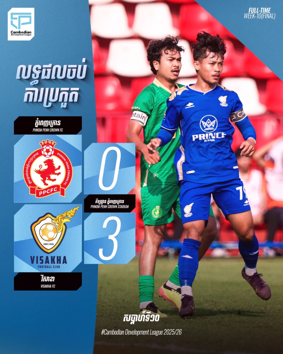 ក្រោយដំណើរការជាង៨ខែ លីគអភិវឌ្ឍន៍កម្ពុជារដូវកាល២០២៥-២០២៦ដែលរៀបចំដោយក្រុមហ៊ុនលីគកម្ពុជា បានបញ្ចប់ការប្រកួតជាផ្លូវការហើយ ដោយក្លឹបបាល់ទាត់វិសាខាក្លាយជាម្ចាស់ជើងឯក ពេលឈ្នះភ្នំពេញក្រោន ៣ទល់នឹង០ ព្រឹកថ្ងៃទី២២ ខែកុម្ភៈ ឆ្នាំ២០២៦នៅកីឡដ្ឋានភ្នំពេញក្រោន។