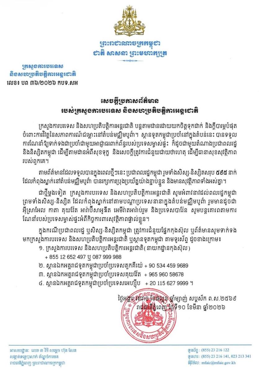 សេចក្តីប្រកាសព័ត៌មានរបស់ក្រសួងការបរទេស ដែលបានចេញកាលពីយប់ថ្ងៃទី១០ ខែមីនា ឆ្នាំ ២០២៦នេះ បានបញ្ជាក់ថា ខ្លួនបានបន្តតាមដានដោយយកចិត្តទុកដាក់ និងក្តីបារម្ភបំផុតចំពោះការវិវត្ត នៃសភាពការណ៍ជម្លោះនៅតំបន់មជ្ឈិមបូព៌ា ហើយស្ថានទូតកម្ពុជាប្រចាំនៅតំបន់នោះ បានទទួលការណែ នាំឲ្យទាក់ទងជាប្រចាំជាមួយអាជ្ញាធរពាក់ព័ន្ធរបស់ប្រទេសម្ចាស់ផ្ទះ ក៏ដូចជាមួយតំណាងប្រជាពលរដ្ឋ និងនិស្សិតកម្ពុជា ដើម្បីតាមដានអំពីសុខទុក្ខ និងសេចក្តីត្រូវការជំនួយជាយថាហេតុ ដើម្បីធានាសុវត្ថិភាព របស់ពួកគេ។