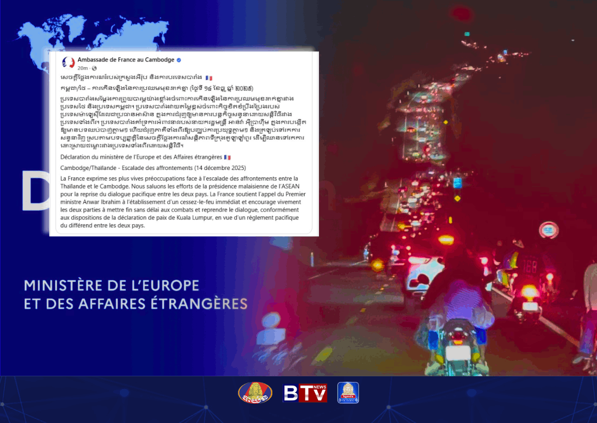 បារាំងប្រកាសគាំទ្រការអំពាវនាវរបស់នាយករដ្ឋមន្ត្រី អាន់វ៉ា អ៊ីប្រាហ៊ីម ក្នុងការបង្កើតឱ្យកម្ពុជា-ថៃ មានបទឈប់បាញ់ភ្លាមៗហើយជំរុញភាគីទាំងពីរឱ្យបញ្ឈប់ការប្រយុទ្ធភ្លាមៗ និងត្រឡប់ទៅរកការសន្ទនាវិញ