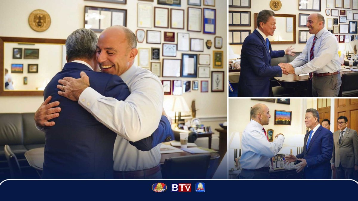 កាយវិការមិត្តភាពដ៏កក់ក្ដៅស្និទ្ធស្នាលរវាងឯកឧត្តម ស៊ុន ចាន់ថុល និងសមាជិកសភាអាមេរិក​បង្ហាញ​ពីមិត្តភាព ការគោរពឱ្យតម្លៃគ្នាទៅវិញទៅមក និងកិច្ចសហការរវាងប្រទេសទាំងពីរ