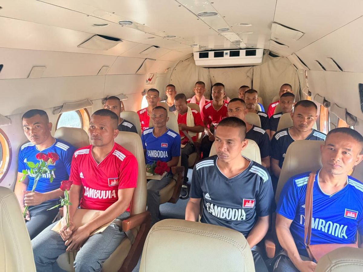 វីរៈកងទ័ពកម្ពុជា១៨រូប បានធ្វើដំណើរតាមឧទ្ធម្ភាគចក្រមកដល់រាជធានីភ្នំពេញហើយ ក្រោយភាគីថៃដោះលែងប្រគល់ឲ្យមកកម្ពុជាវិញ