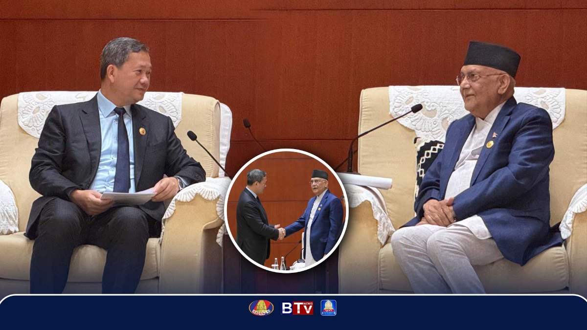 នៅព្រឹកថ្ងៃទី១ ខែកញ្ញា ឆ្នាំ២០២៥នេះ សម្ដេចមហាបវរធិបតី ហ៊ុន ម៉ាណែត នាយក​រដ្ឋមន្រ្ដី​នៃ​កម្ពុជា បានអញ្ជើញជួបជាមួយ ឯកឧត្តម Khadga Prasad Sharma Oli នាយករដ្ឋមន្ដ្រីនេប៉ាល់ ក្នុងជំនួបទ្វេភាគី និងពិភាក្សាការងារ នៅទីក្រុងធានជីន សាធារណរដ្ឋប្រជាមានិតចិន។សូមជម្រាបថាសម្តេចធិបតី ហ៊ុន ម៉ាណែត នាយករដ្ឋមន្ត្រី កំពុងដឹកនាំ គណៈ​ប្រតិភូ​ជាន់​ខ្ពស់​កម្ពុជា​ អញ្ជើញចូលរួមកិច្ចប្រជុំកំពូលអង្គការសហប្រតិបត្តិការសៀងហៃ បូក ដែលប្រព្រឹត្ត​ទៅចាប់​ពី​ថ្ងៃ​ទី៣០ ខែសីហាដល់ថ្ងៃទី១ ខែកញ្ញា ឆ្នាំ២០២៥ននេះ នៅទីក្រុងធានជីន សាធារណរដ្ឋ ប្រជាមា​និត​ចិន តបតាមការអញ្ជើញរបស់ ឯកឧត្តម ស៊ី ជីនពីង ប្រធានាធិបតីនៃសាធារណរដ្ឋ ប្រជាមានិតចិន៕