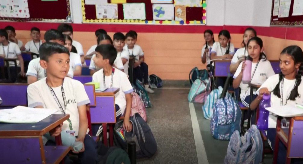 សាលារៀននៅទីក្រុងញូវដែលី ប្រទេសឥណ្ឌា រោទិ៍កណ្តឹងទឹក ដើម្បីធ្វើឲ្យសិស្សមានជាតិទឹក ស្របពេលអាកាសធាតុក្តៅខ្លាំង