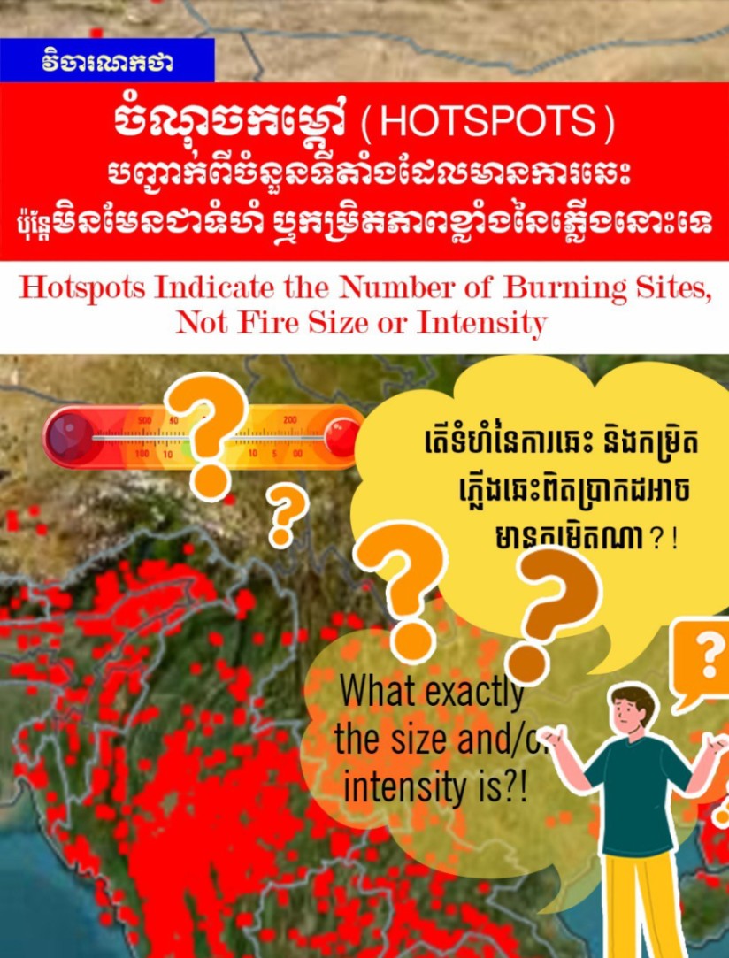 វិចារណកថា ក្រសួងបរិស្ថាន៖ ចំណុចកម្តៅ (Hotspots) បញ្ជាក់ពីចំនួនទីតាំងដែលមានការឆេះ ប៉ុន្តែមិនមែនជាទំហំ ឬកម្រិតភាពខ្លាំងនៃភ្លើងនោះទេ(អាំងតង់ស៊ីតេ)
