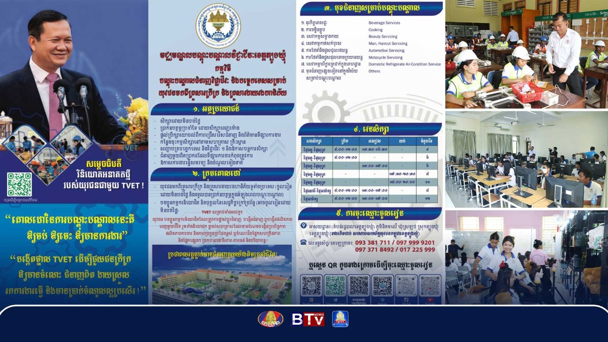 មជ្ឈមណ្ឌលបណ្តុះបណ្តាលវិជ្ជាជីវៈខេត្តត្បូងឃ្មុំ ផ្តល់អាហារូបករណ៍ ៣២៥៥កន្លែង លើ ៧មុខជំនាញ និងប្រាក់ឧបត្ថម្ភ ដល់យុវជនមកពីគ្រួសារក្រីក្រ