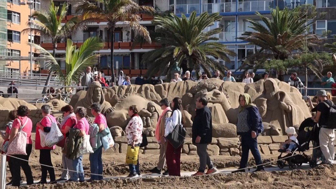 ភ្ញៀវទេសចរនៅអេស្ប៉ាញភ្ញាក់ផ្អើលនឹងចម្លាក់ដីខ្សាច់ Sand Nativity Scene