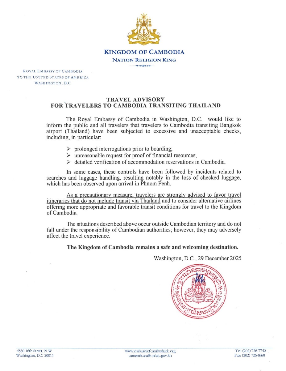 ស្ថានឯកអគ្គរាជទូតកម្ពុជាប្រចាំសហរដ្ឋអាមេរិក បានជូនដំណឹងដល់សាធារណជន និងអ្នកដំណើរទាំងអស់ជ្រាបថា អ្នកដំណើរដែលបានធ្វើដំណើរទៅប្រទេសកម្ពុជាដោយឆ្លងកាត់ (Transit) អាកាសយានដ្ឋានទីក្រុងបាងកក ប្រទេសថៃ បានជួបបញ្ហាដ៏លំបាកជាច្រើនលើការត្រួតពិនិត្យដ៏ស្មុគស្មាញ ដូចជា៖