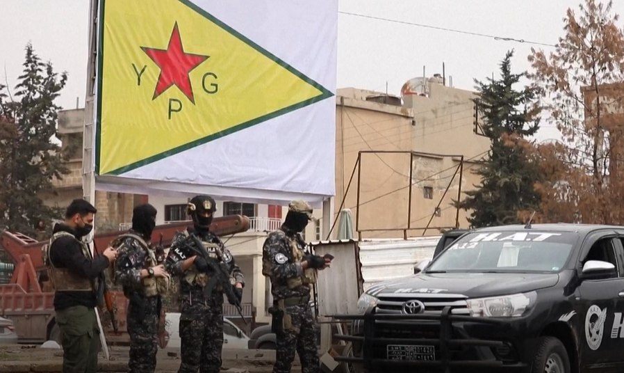 សមាជិកកងកម្លាំងសន្តិសុខផ្ទៃក្នុងឃឺដនៅទីក្រុង Qamishli រង់ចាំការមកដល់របស់កងកម្លាំងរដ្ឋាភិបាលស៊ីរី